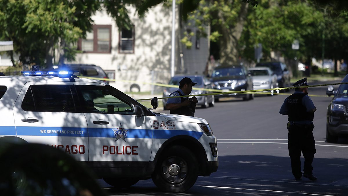 (Photo:Chicago Police officers standing next to a police car and a taped off crime scene. Credit: Joshua Lott/AFP/Getty Images)