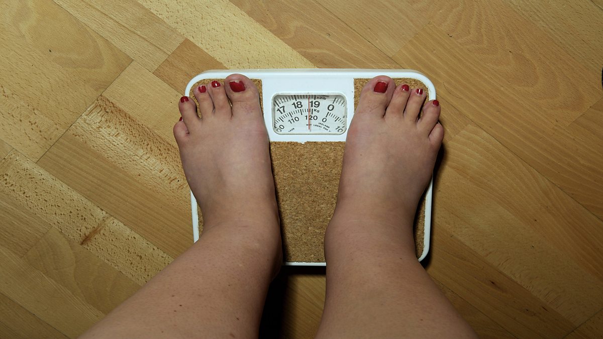 Photo Caption: A woman stands on a bathroom scale