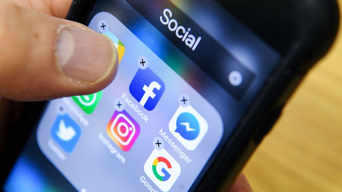 Photo caption: a man holds a smartphone with the icons for various social networking apps seen on the screen.