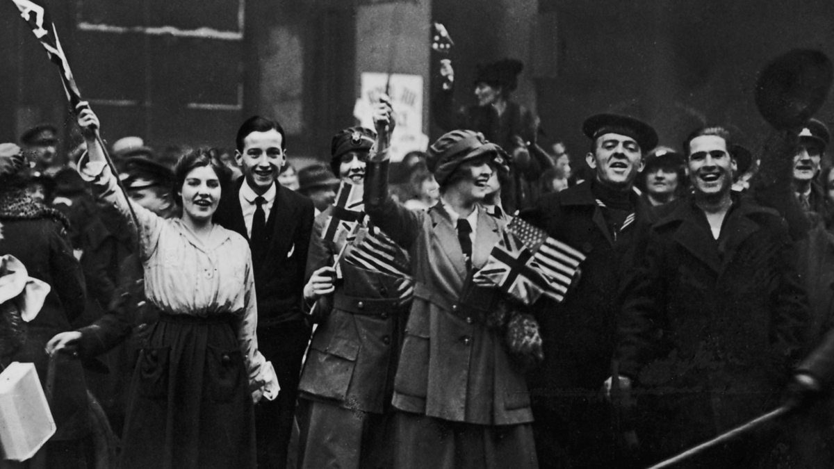 (Photo: Service men and women and civilians celebrating Armistice Day in November 1918. Credit: Topical Press Agency/Getty Images)