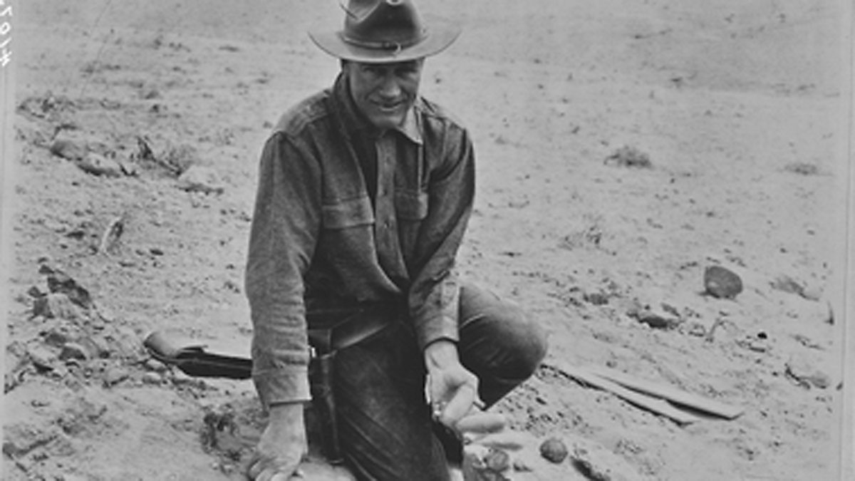 Photo: Roy Chapman Andrews examining first find of dinosaur eggs by George Olsen, Mongolia, 1925 (courtesy of AMNH Research Library)