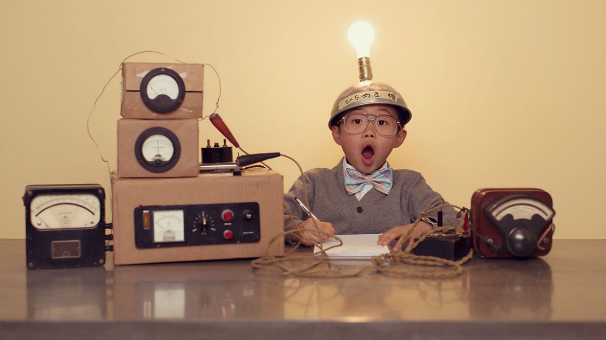 (Image: A young boy sits at an office desk searching for successful ideas using a homemade thinking cap with a lit up light bulb. Credit: Getty Images)