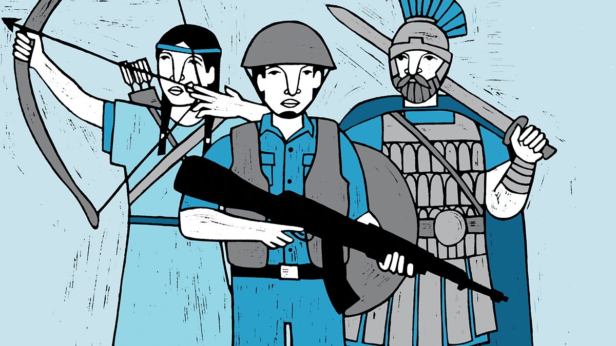(Illustration: A warrior with bow and arrow, a soldier and a Roman centurion)