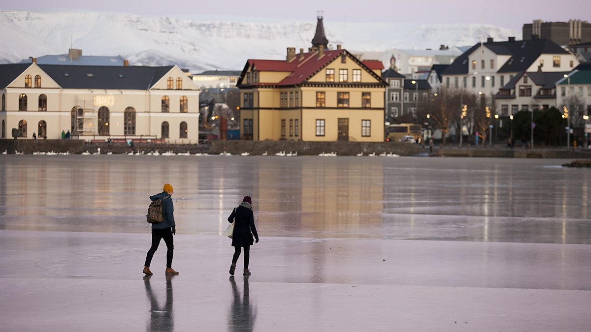 Image: Two people walk across a frozen lake in central Reykjavik (Credit: Christian Science Monitor via Getty Images)