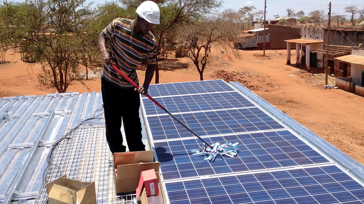 (Photo: Solar panels on the Kitonyoni grid are cleaned. Credit: BBC)