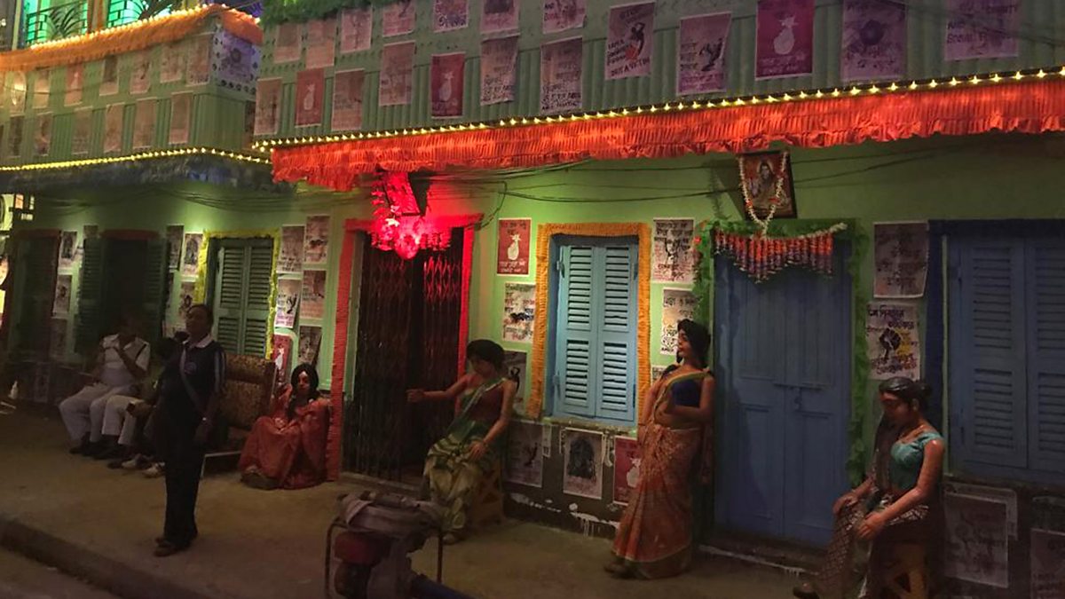 (Photo: The street and houses leading up to the brothel pandal with dummies of sex workers. Credit: Amit Chaudhuri)