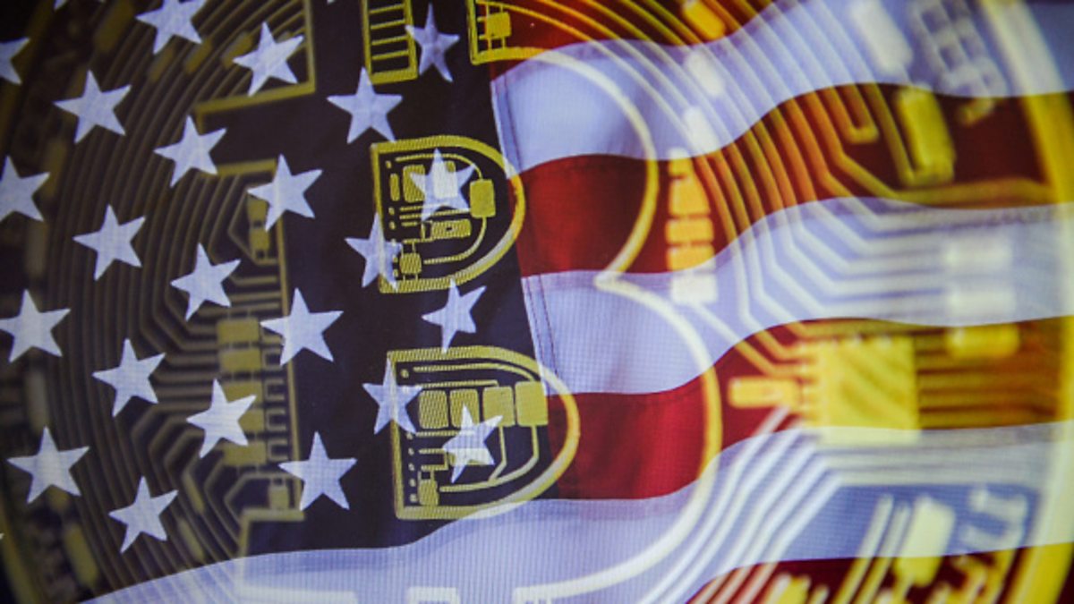 (Photo: In this photo illustration a double exposure picture with bitcoin coin and American flag. Credit: Omar Marques/SOPA Images/LightRocket via Getty Images)