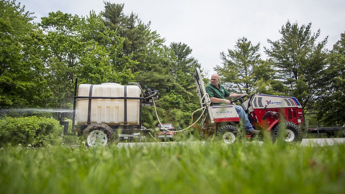 (David Melevsky, owner of Go Green Organic Land Care, treats grass areas that have been reseeded to repair winter damage with fertilizer at Ocean Park Meadow condos. Credit: Derek Davis/Getty Images)