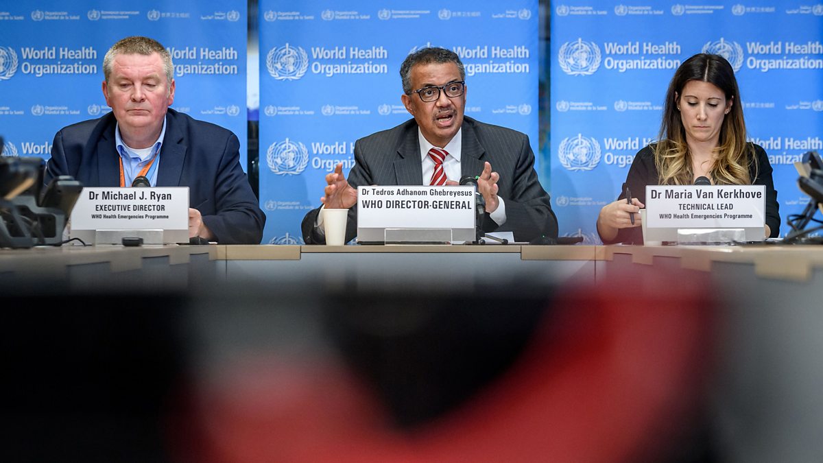 (From L) World Health Organization (WHO) Health Emergencies Programme Director Michael Ryan, WHO Director-General Tedros Adhanom Ghebreyesus and WHO Technical Lead Maria Van Kerkhove attend a daily press briefing on COVID-19, the disease caused by the novel coronavirus, at the WHO headquarters in Geneva. Credit: Fabrice Coffrini/Getty Images)