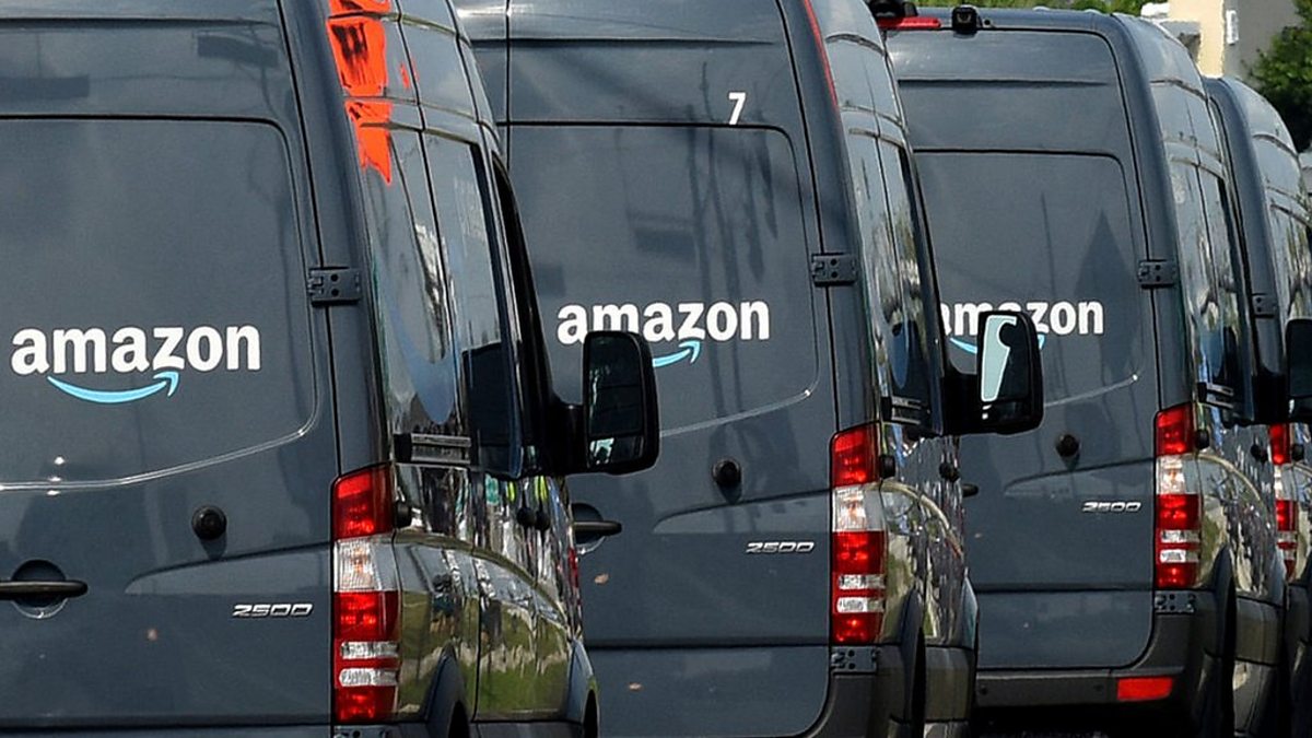 (Photo: Amazon-branded delivery vans seen in May 2019, Credit: Getty Images)