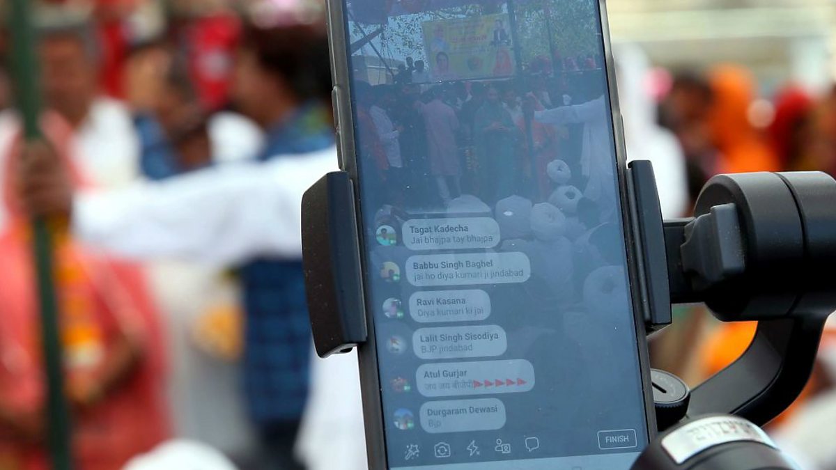 (Picture: A supporter seen doing a Facebook live as a political party candidate speaks during her campaign rally ahead of elections at a village in Merta, India, on April 20, 2019. Credit: Hindustan Times via Getty Images)