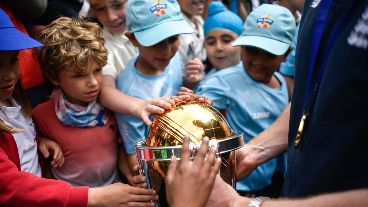 Photo: Schoolchildren touch the Cricket World Cup trophy at The Oval (Getty Images)