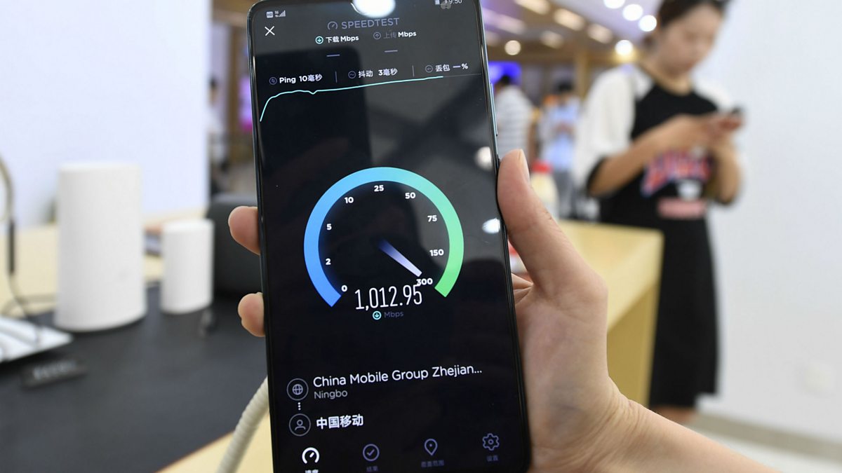 (Image: A 5G handset showing fast download speeds at a Huawei store in China, Credit: Getty Images).