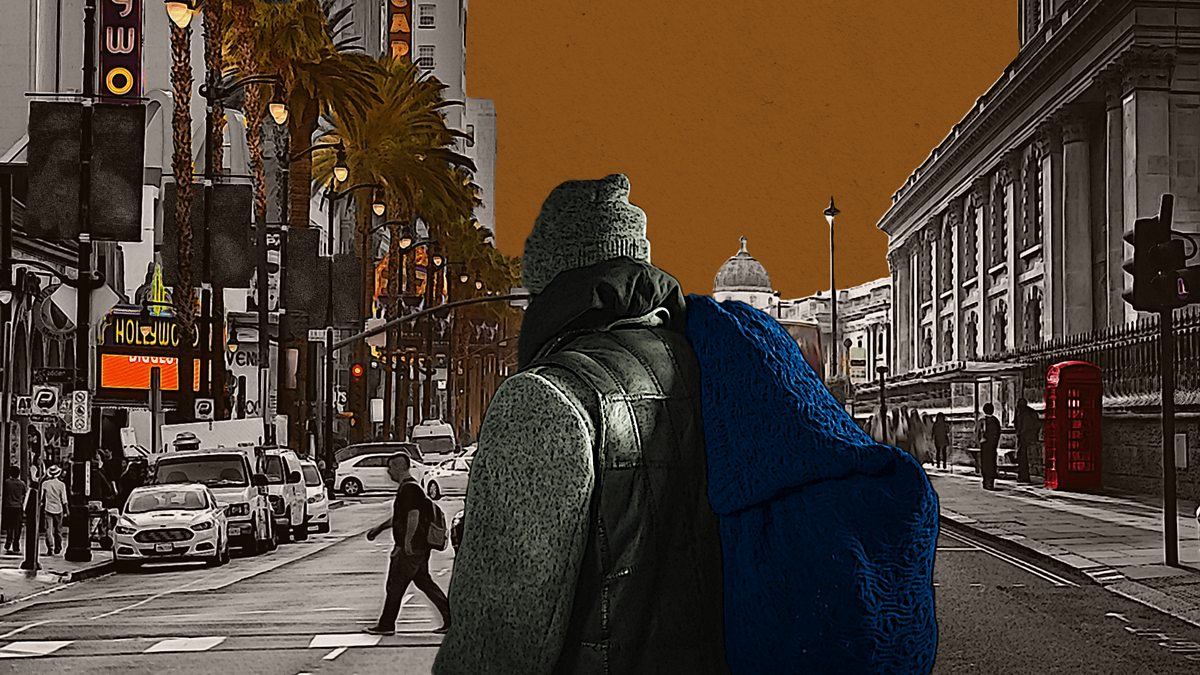 (Photo: Homeless man looks out on LA and London streets. Credit: BBC/Getty Images)