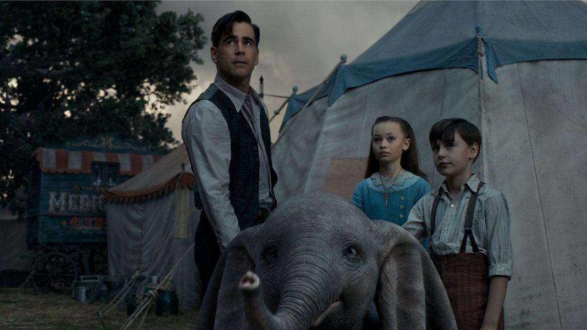 Image shows Colin Farrell in Dumbo with Nico Park and Finley Hobbins (c) Disney Enterprises