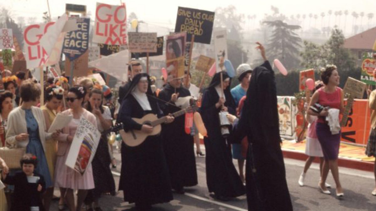 (Photo: Nuns from the Sisters of the Immaculate Heart of Mary play guitars at the Mary's Day parade, 1964. Courtesy of the Immaculate Heart Community)