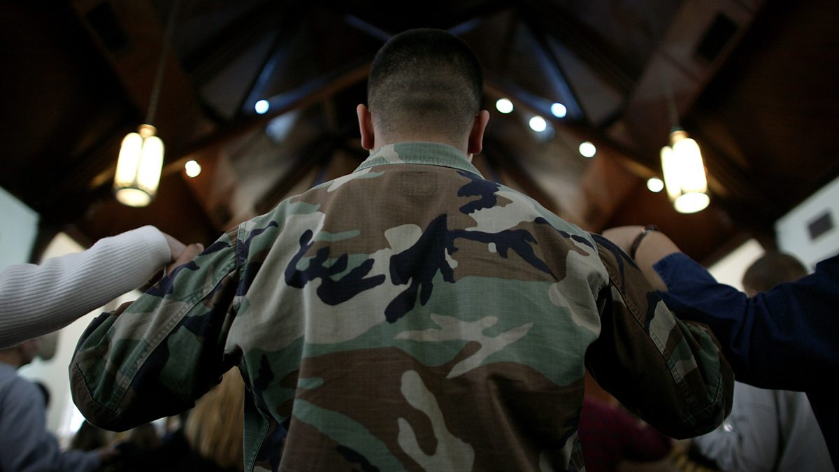 Image: Young US Army soldiers attend a Sunday morning Catholic service on base at Fort Levinworth in Kansas in February 2003 (Credit: Charles Ommanney/Getty Images)