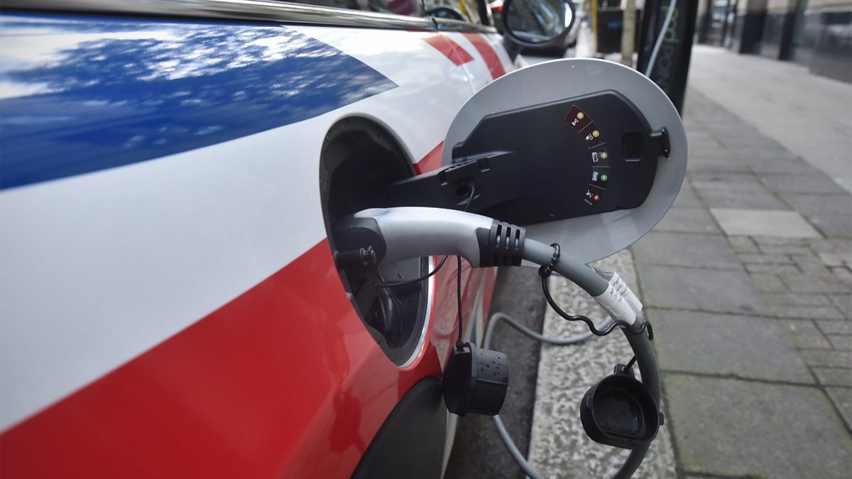 (Image: Electric Mini Cooper charging on a central London street, Credit: BBC).