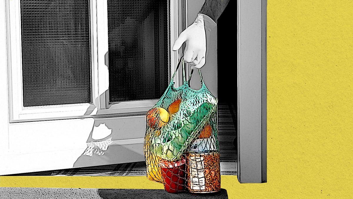 (Picture: A man in quarantine taking delivery of groceries. Credit: Getty Images/BBC)