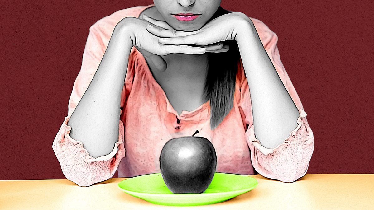 (Picture: A woman staring at an apple on a plate. Credit: Getty Images/BBC)