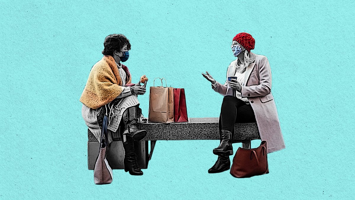 (Picture: Two women sit on a bench talking, Credit: Getty/BBC)