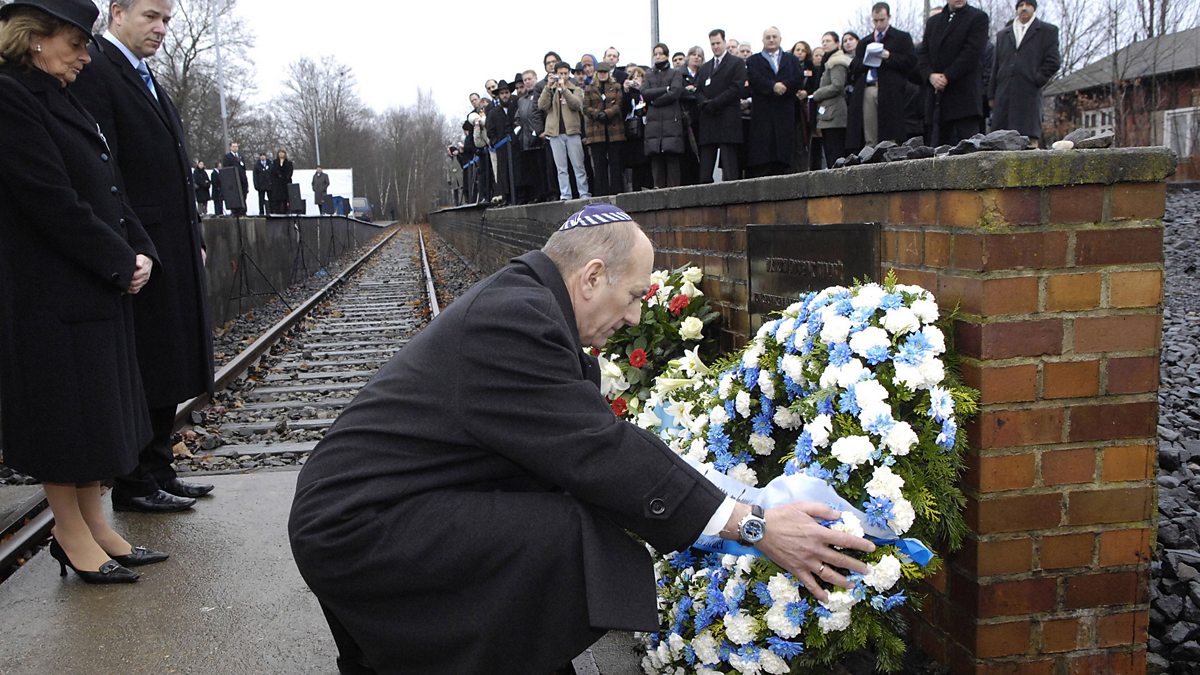 (Photo: Israeli PM Ehud Olmert (R) lays down a wreath during a ceremony at Grunewald railway station. Some 50, 000 Jews were deported from the station between 1941-45. Credit: Thorsten Leukert/Getty Images)