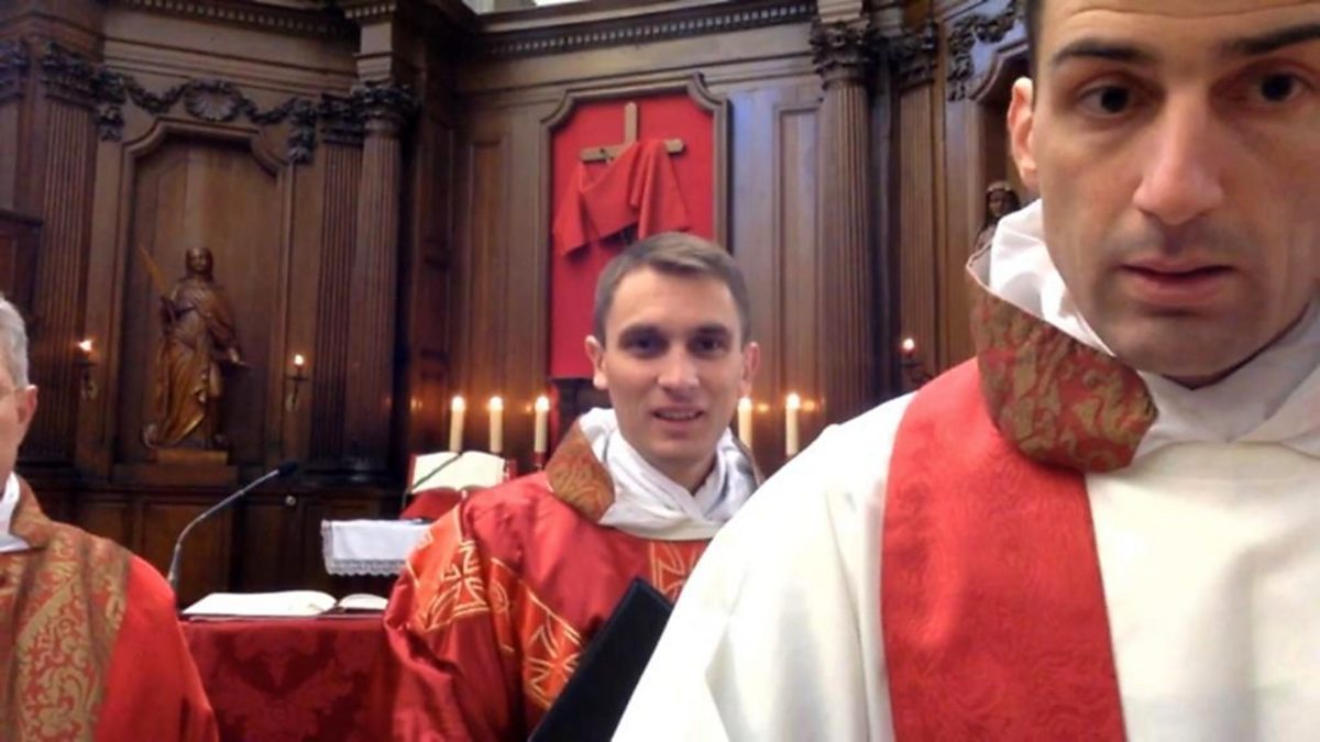 (Photo: French Priests check camera for live Palm Sunday YouTube mass. Credit: BBC)