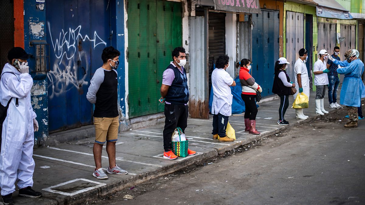 Picture: Employees of the Ciudad de Dios market wait respecting safety distances to be tested by workers of the Health Ministry to discard COVID-19 in Lima on May 11, 2020. Credit: Ernesto Benavides/AFP via Getty Images