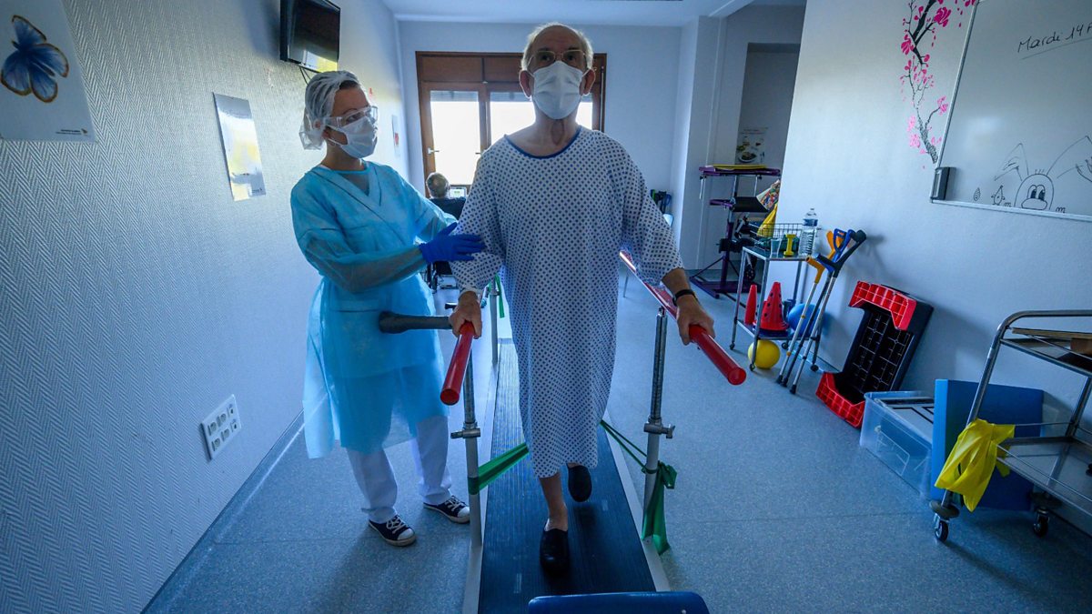 Picture: A physiotherapist takes care of a patient in rehabilitation as he recovers from an infection with the coronavirus COVID-19, Credit: Patrick/AFP via Getty Images