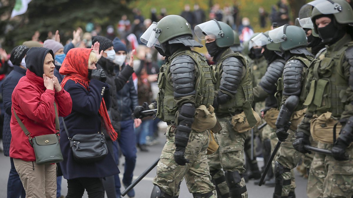 Minsk, early December. A wall of masked men in black body armour, beating their truncheons on steel shields. In front of them stand women bundled in winter coats and teenagers wrapped in red and white flags. They are singing a protest song once heard in the revolutionary shipyards of Gdansk a generation before - an anthem for democracy and change. For more than one hundred days these versions of Belarus have advanced and retreated - and now they seem locked in impasse.
