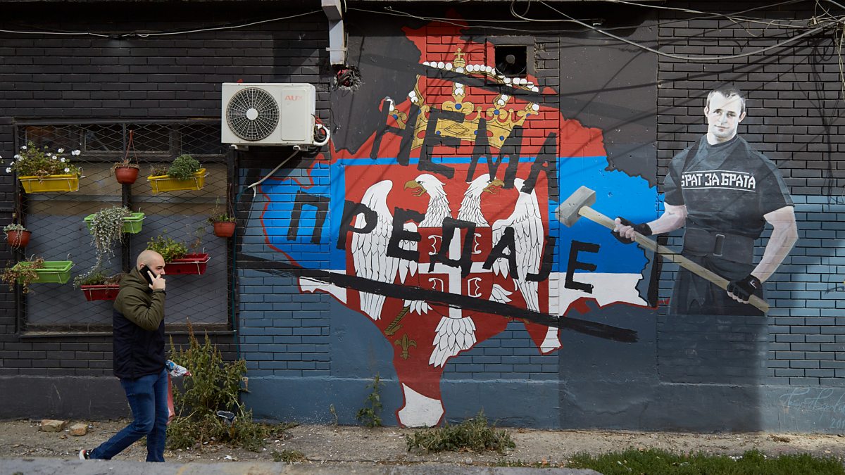A man walks past a Serb nationalist mural reading ‘Never Surrender’ over a map of Kosovo in North Mitrovica on October 24, 2020. Mitrovica is divided between a Kosovo-Albanian and a Kosovo-Serb area. Credit: Pierre Crom / Getty Images.