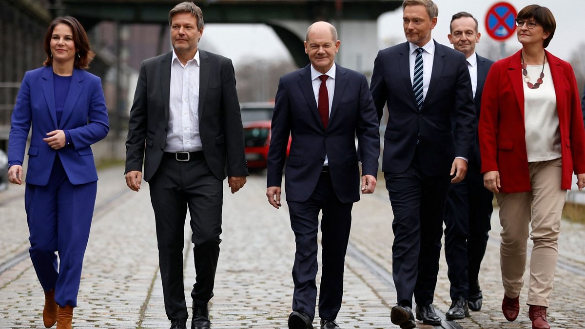 (Picture: Leaders of the incoming German government, including Chancellor-elect Olaf Scholz (centre), inadvertently re-enact the opening scene from Reservoir Dogs; Credit: Odd Andersen/AFP via Getty Images)