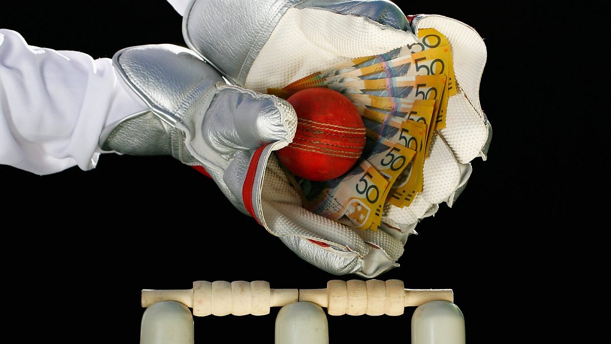 Photo: A cricket ball is caught in a pair of wicket keeping gloves with a fan of Australian fifty dollar notes (Credit: Getty images)