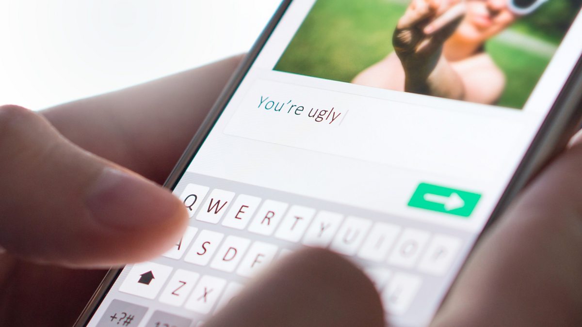 (Image: Internet troll sending comment to picture on imaginary social media website with smartphone