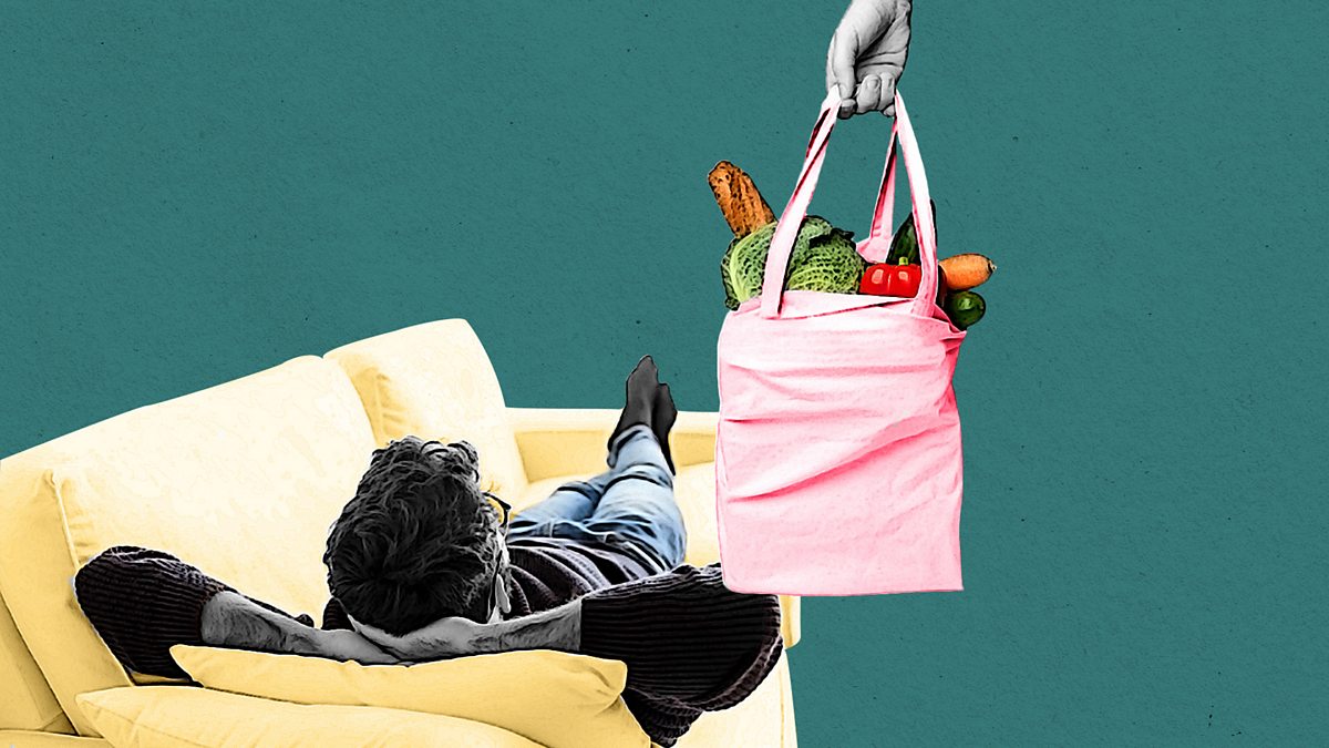 (Picture: Man sat on sofa groceries being handed to him. Credit: Getty/BBC)