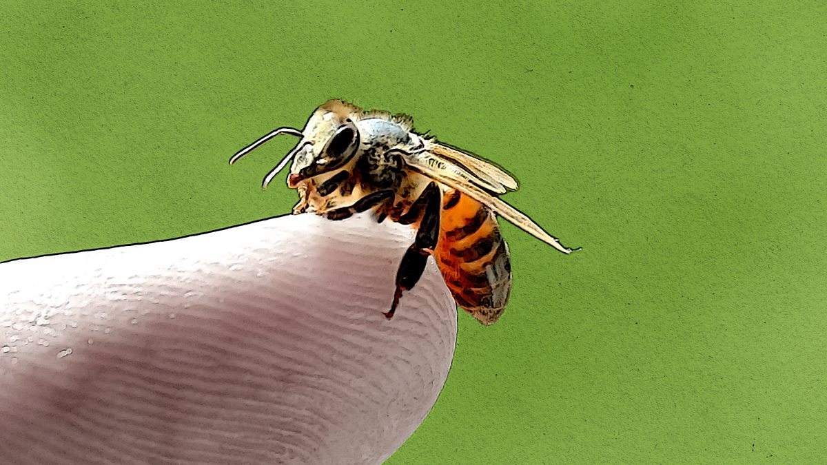 (Picture: A honey bee on the end of a human finger. Credit: Getty Images/BBC)
