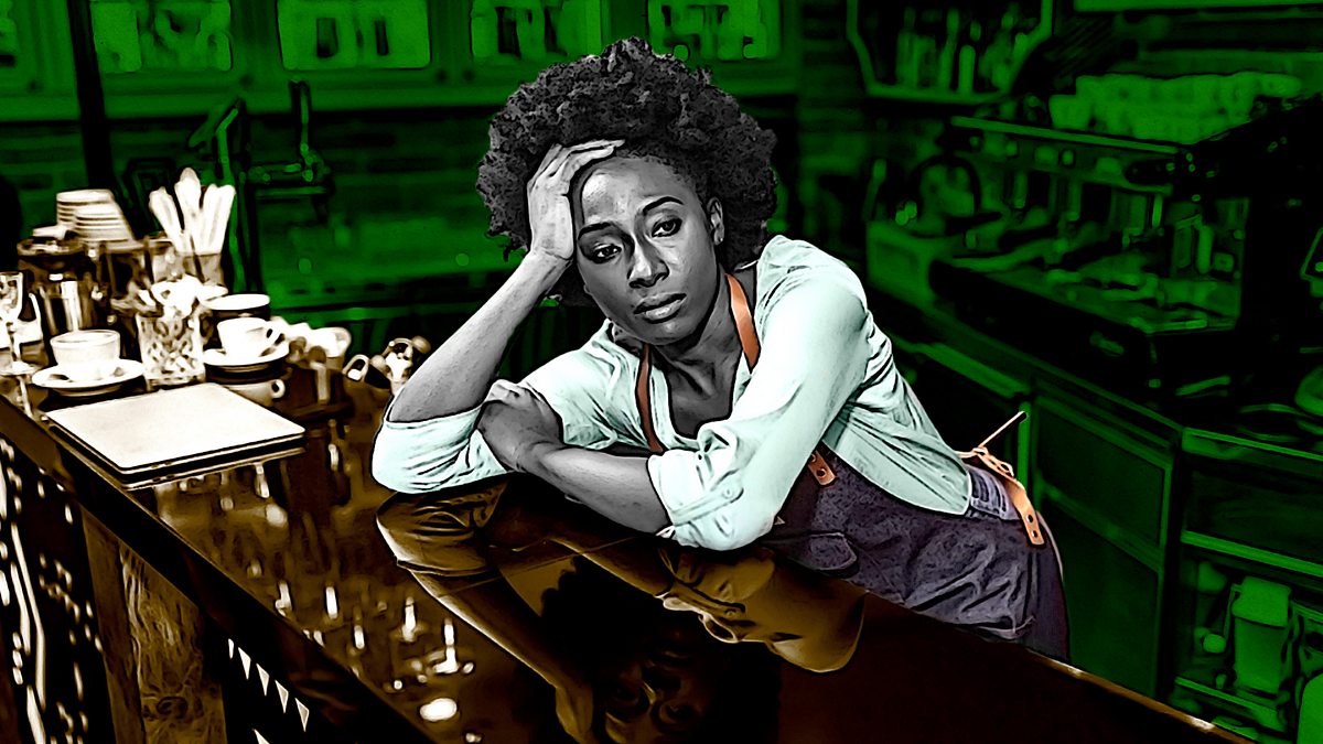 (Picture: Upset waitress leaning on a bar. Credit: Getty Images/BBC)