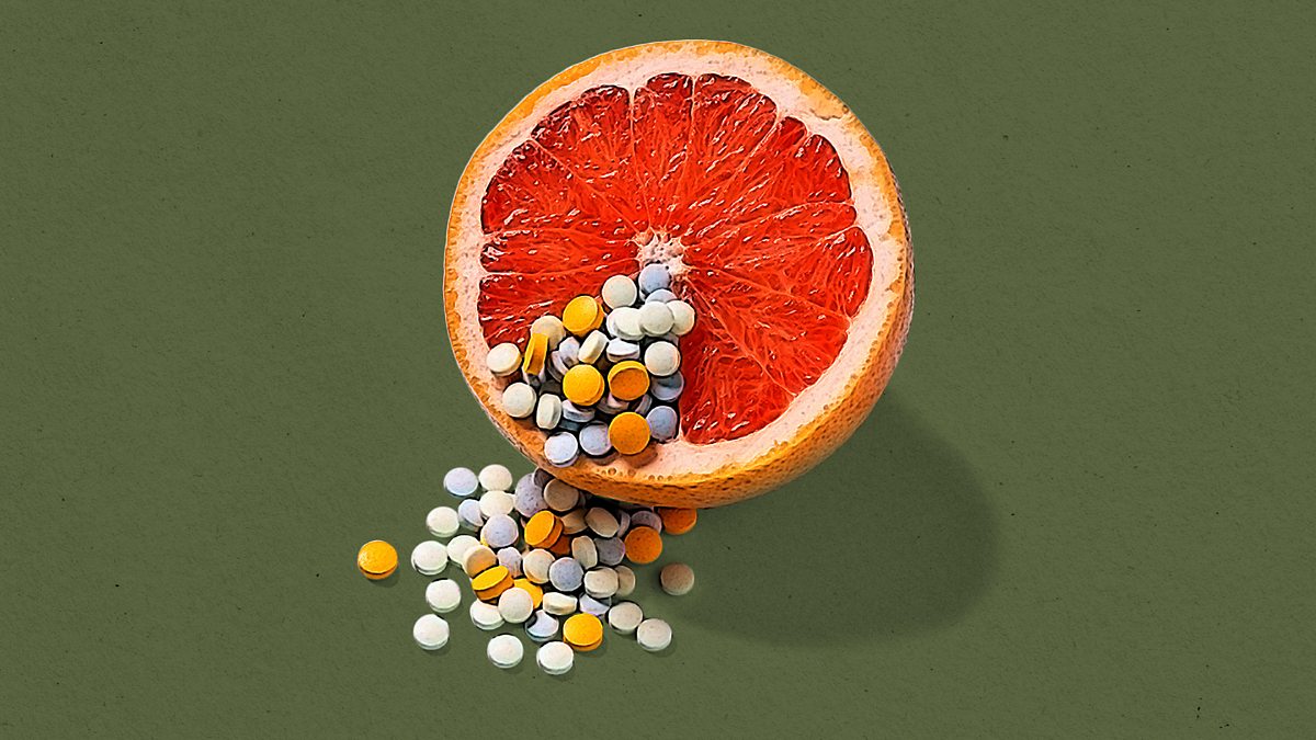 (Picture: Grapefruit with pills coming out of it. Credit: Getty/BBC)