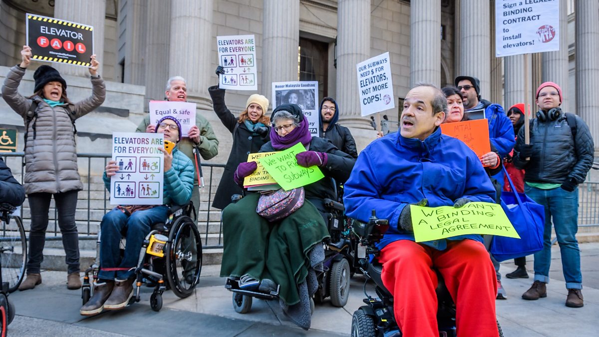 (Image: Disability rights protesters at a rally outside a New York courthouse, Credit: Erik McGregor/Getty Images)