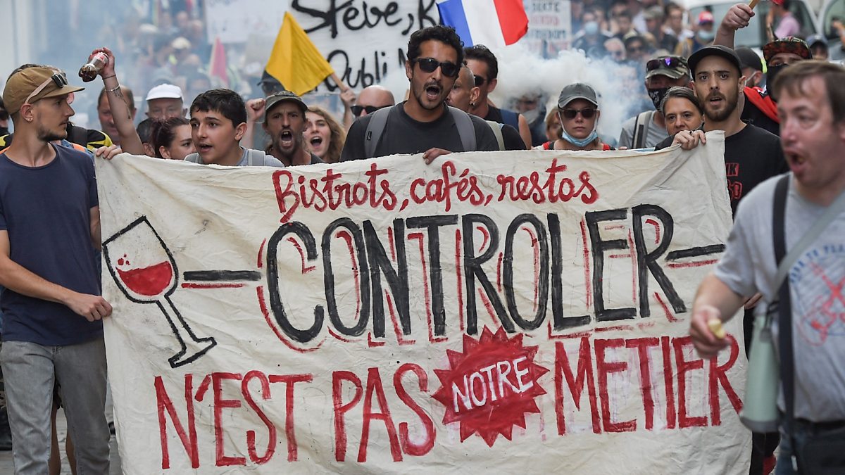 (Photo: Demonstrators hold a banner reading "Bistros, cafes, restaurants: to control is not our job" in Nantes, September 2021, Credit: Sebastien Salom-Gomis/AFP via Getty Images)