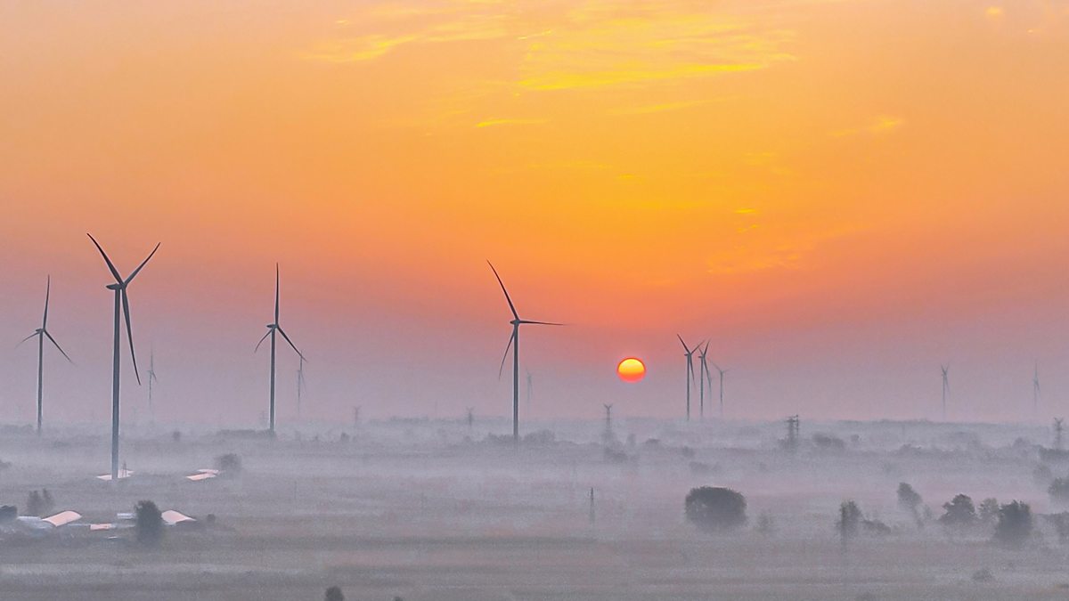 (Photo: Wind-powered windmills under the sunrise in Suqian, Jiangsu Province. Credit: Zhang Lianhua /Costfoto/Barcroft Media/Getty Images)