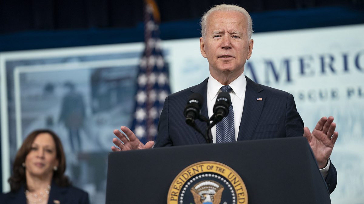 (Photo: US President Joe Biden speaks as Vice President Kamala Harris (L) looks on at an event marking the day that families will get their first monthly Child Tax Credit relief payments through the American Rescue Plan. Credit: Alex Edelman/ EPA)