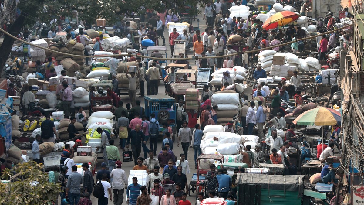 (Photo :People walk through a congested road of a wholesale market in the old quarters of Delhi, India; Credit: EPA/RAJAT GUPTA)