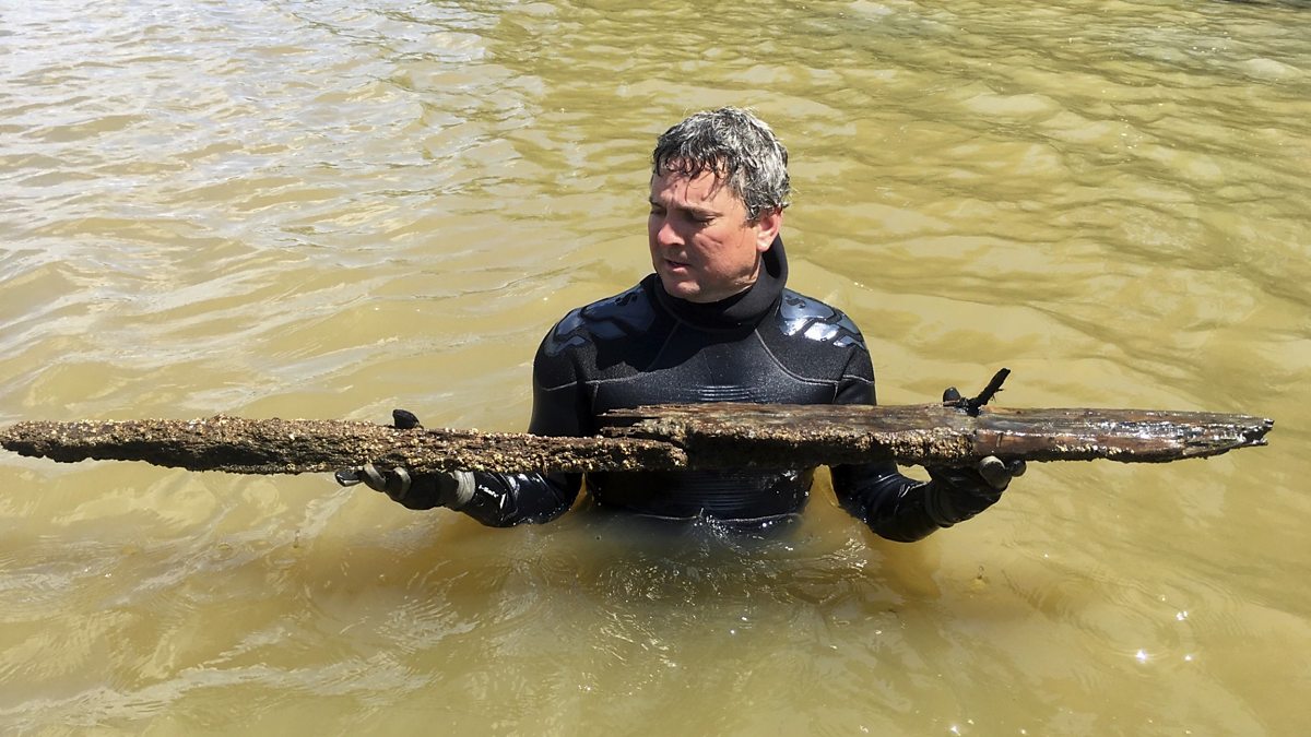 (Photo: Ben Raines standing in the water holding a piece of the Clotilda. Credit: Joe Turner/Ben Raines)