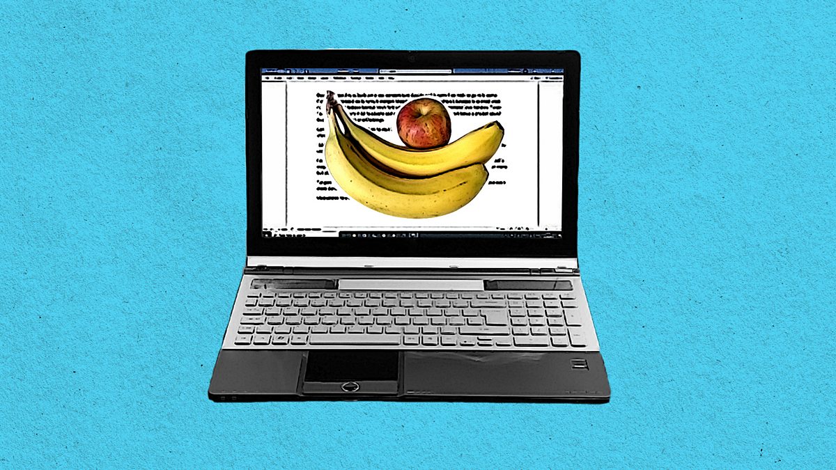 (Picture: Image of an apple and two bananas on a laptop screen. Credit: Getty/BBC)