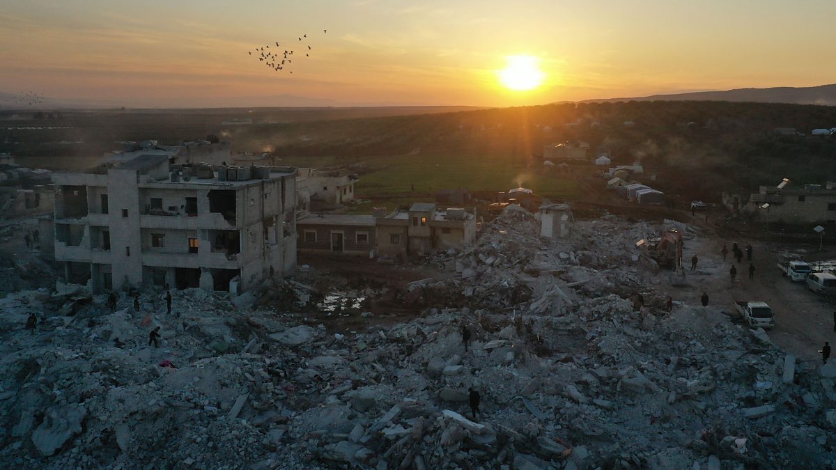 Picture on website: An aerial view shows destroyed buildings after a deadly earthquake that hit Turkey and Syria. (Photo by OMAR HAJ KADOUR/AFP via Getty Images)