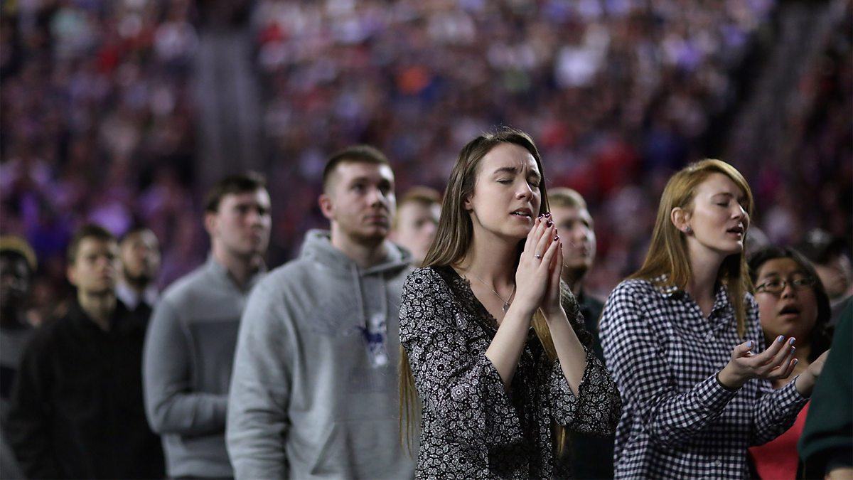 (Photo: Thousands of students, supporters and invited guests sing songs of Christian praise before Republican presidential candidate Donald Trump delivers the convocation in the Vines Center, Liberty University campus, 18 January, 2016 in Lynchburg, Virginia. Credit: Chip Somodevilla/Getty Images)