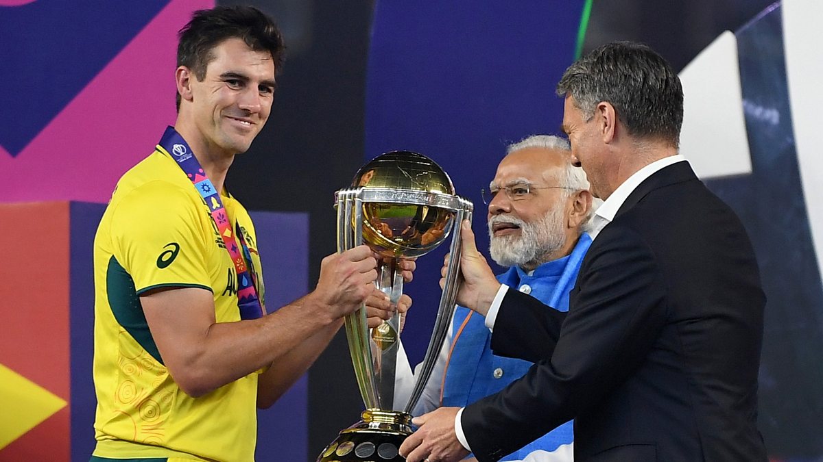 Photo: Australia captain Pat Cummins is presented with the trophy by Narendra Modi, Prime Minister for India and Richard Marles, Deputy Prime Minister of Australia after winning the ICC Men's Cricket World Cup India 2023 Final between India and Australia at Narendra Modi Stadium on November 19, 2023 in Ahmedabad, India. (Credit: Getty Images)
