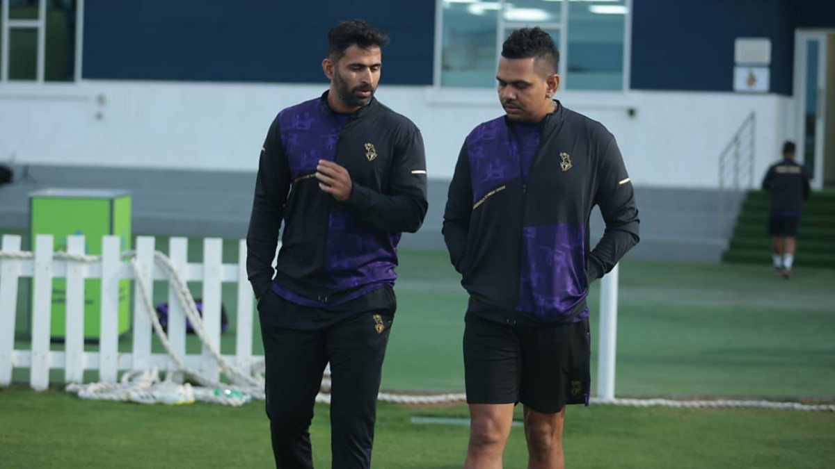 Photo: Kolkata Knight Riders Head of Talent Scouting, Abhishek Nayar, speaking with spinner Sunil Narine. (Credit: Kolkata Knight Riders)