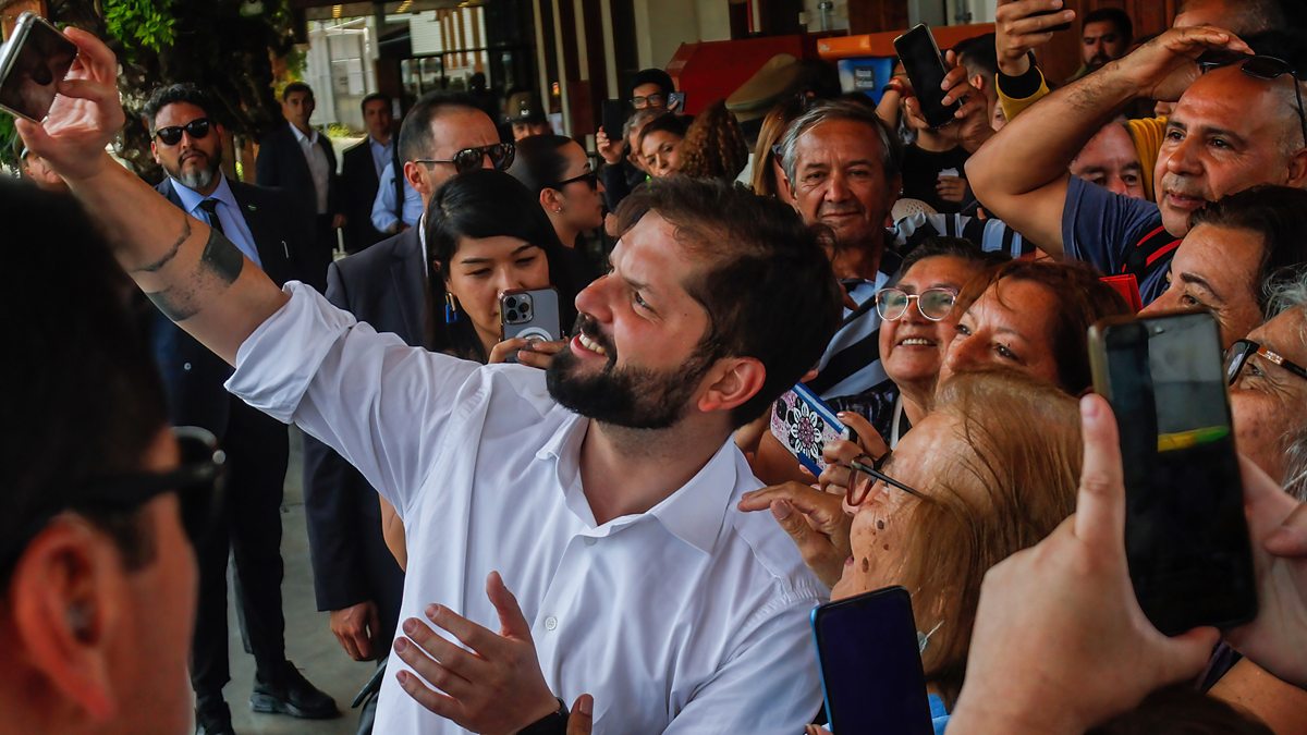 (Photo: Chilean President Gabriel Boric Font takes a selfie with the audience after a press conference. Credit: Cristobal Basaure Araya/Getty Images)